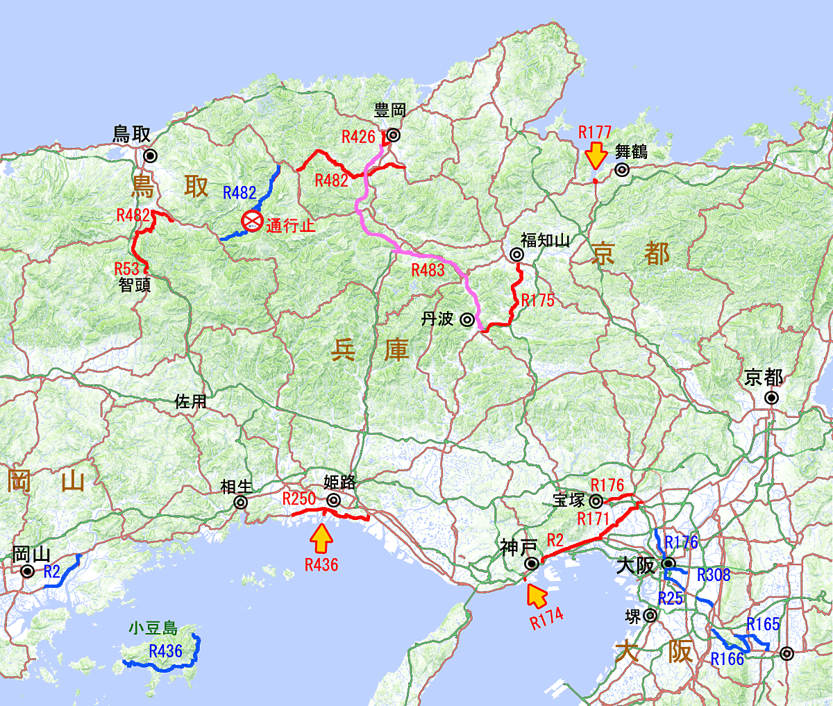 ツーリングレポートはまた追ってアップしますが、今回走ったのは地図の赤とピンクの部分です。これで近畿・中国地方の国道は未走行区間(青色:162㎞)を残してほぼ全て走ったことになります。正確には距離ベースで98.7%、国道数ベースで100%です。\(^o^)/