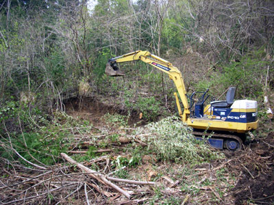 地点② 2008年4月22日 すぐに大きな切り株に突き当たりました。 スコップで周りを掘ってからコマツ君で引き抜きます。
